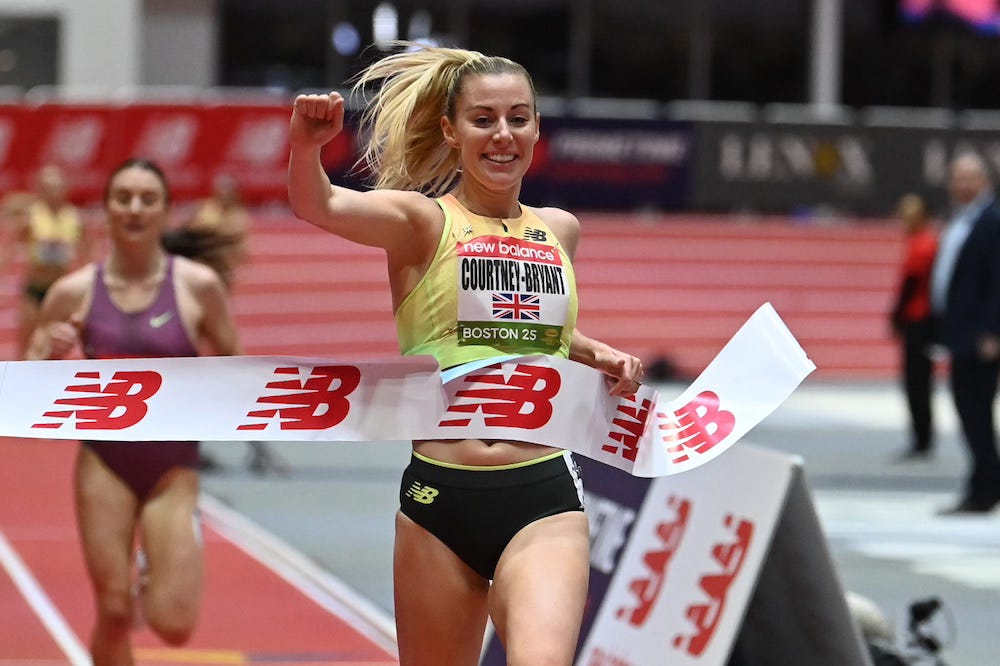 After Nikki Hiltz ran 8:32.52 on Friday and Shelby Houlihan ran 8:31.56 on Saturday, Great Britain’s Melissa Courtney-Bryant ran 8:28.69 at Sunday night’s New Balance Indoor Grand Prix, topping them both and taking over the world lead. After her quick mile on Friday, Elise Cranny bounced back with a second-place finish in the 3,000m, running an indoor personal best of 8:29.78 and taking over the U.S. lead.