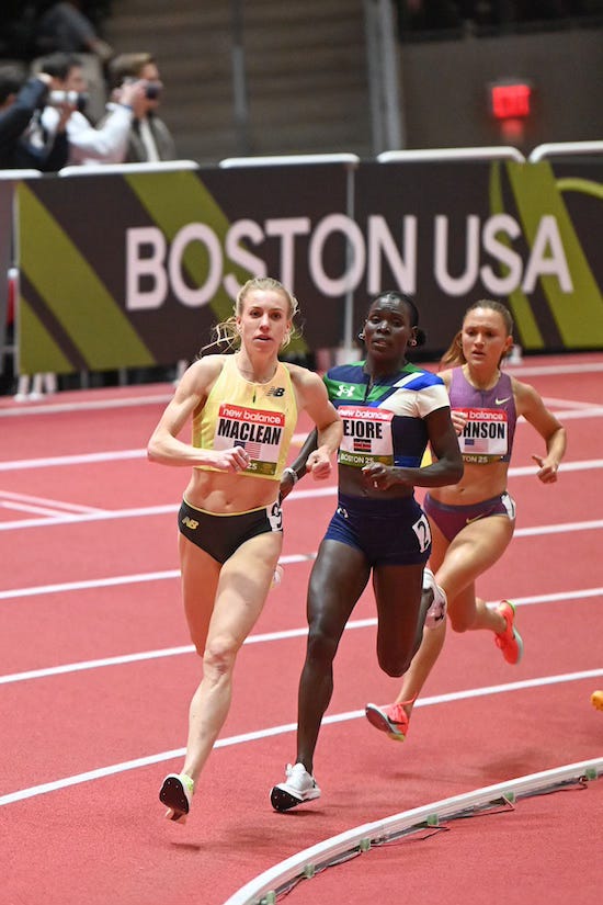 Earlier in the meet, before the TV window began, New Balance Boston’s Heather MacLean won an exciting mile at home. She took the lead with about 400m remaining and held off challenges from Kenya’s Susan Ejore-Sanders and Sinclaire Johnson to win in 4:23.32, breaking her own meet record from 2023.