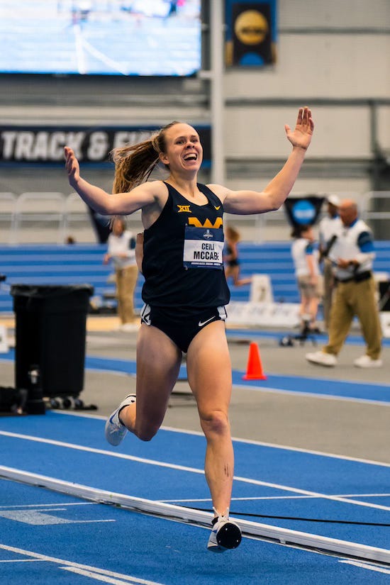 West Virginia University’s Ceili McCabe, 23, has been in the NCAA since the fall of 2019. Heading into Saturday’s 3,000m final, she had earned All-America honors nine times. She had finished third at a national championship three times, but it was beginning to look like she might finish out her eligibility without winning a national title.