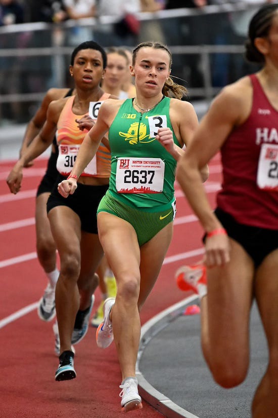 Some collegiate coaches might limit their athletes’ non-NCAA racing opportunities mid-season, but to Oregon’s credit, they let Nielsen travel to the Netherlands to represent Sweden in the 800m at the European Athletics Indoor Championships one week prior to NCAAs. (She says because she’s young and not particularly tall, she can sleep anywhere.) Nielsen fell across the line in the semifinal last week and missed advancing to the final by 0.02 seconds. Now she’s off to China to race the 800m at World indoors this Friday. I wish someone had asked her how she makes the education part of college work with her recent travel schedule. (Mile results | Mile replay)