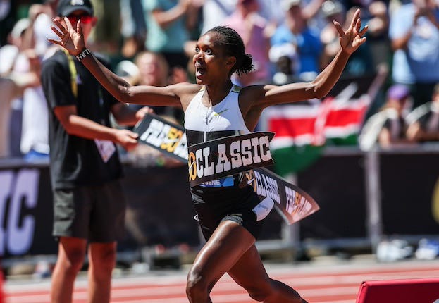 Faith Kipyegon will be racing for the first time since she broke her own 1500m world record at the Prefontaine Classic. She’s entered in the 3,000m, a distance she hasn’t raced since 2022. Her PR, 8:23.55, dates all the way back to 2014. Back in May, when Chebet ran the second-fastest 3,000m ever, I wrote about the suspicious circumstances under which China’s Wang Junxia set the world record of 8:06.11 in 1993.