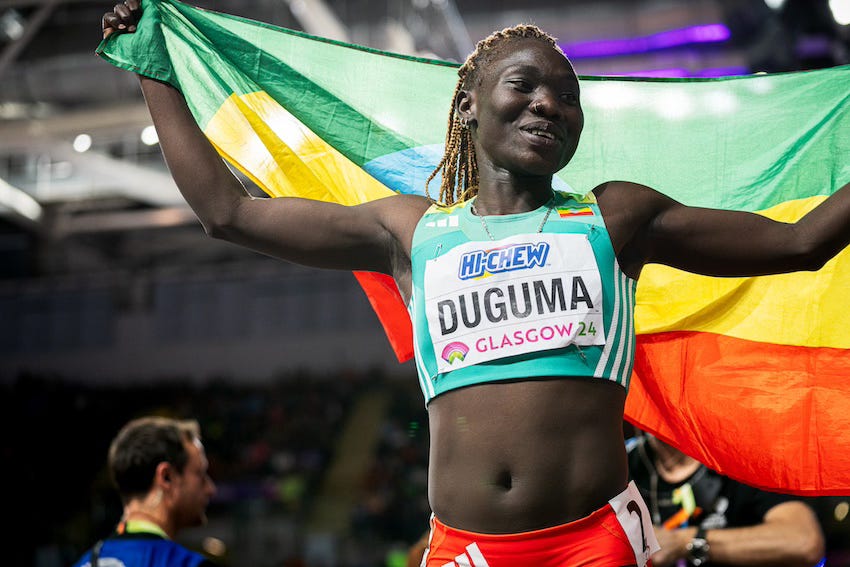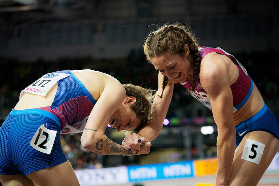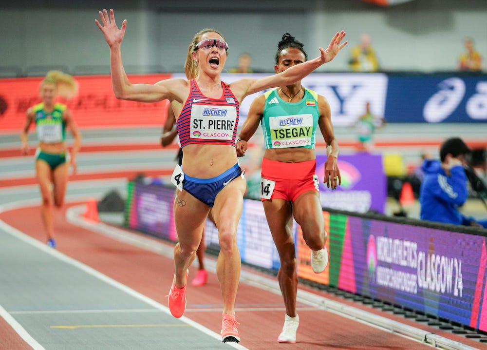 World Indoors doesn’t attract the depth that an outdoor championship does, but an American woman winning a global championship with one of the fastest times ever is a really big deal. As is beating Tsegay. She’s a two-time world champion outdoors, having won the 5,000m in 2022 and the 10,000m in 2023. And she holds the world record in the 5,000m (14:00.21). Like St. Pierre, Tsegay is also a miler, so she’s not that easy to outkick. She has run 1:57.52 for 800m, and she holds the world indoor 1500m record (3:53.09).