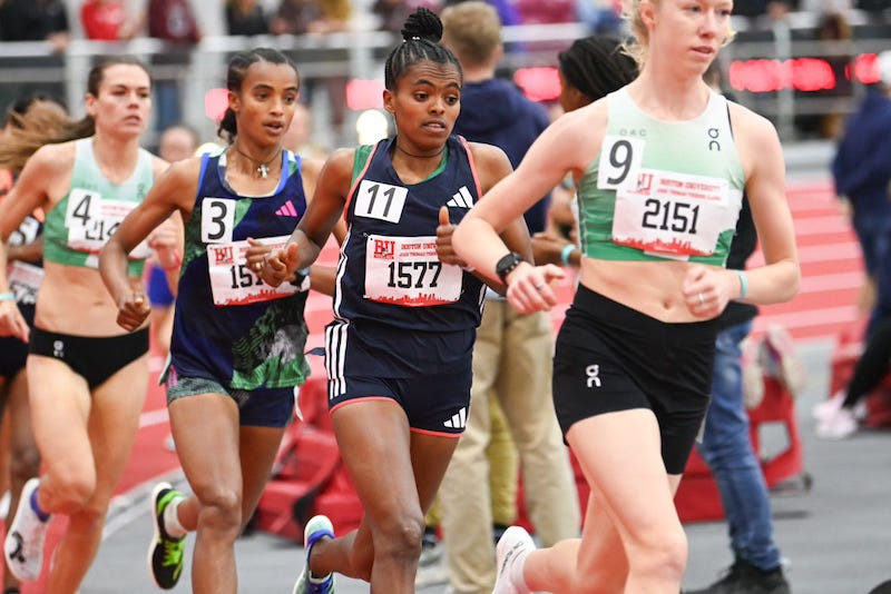 At Boston University’s Terrier Classic, Ethiopia’s Senayet Getachew, 18, won an exciting 5,000m race in 14:42.94 and broke Tirunesh Dibaba’s world U20 record that stood for 20 years. (Dibaba set the record across town, at the Reggie Lewis Center. All of the indoor records would be faster if the rest of the world had easier access to Boston’s indoor tracks.) It was an Ethiopian sweep as Fentaye Belayneh took second (14:43.25), and Aynadis Mebratu took third (14:44.94). Marta García Alonso (14:46.37, Spanish record), Josette Andrews (14:46.51), and Courtney Wayment (14:49.78) all ran under the Olympic standard (14:52.00). Alicia Monson rabbited the race through 3400m, returning a favor after Andrews, her teammate, helped her set the North American 10,000m record last year. Rachel Smith continued her postpartum return with an impressive 15:10.10 to take seventh. (Results | 5,000 replay)
