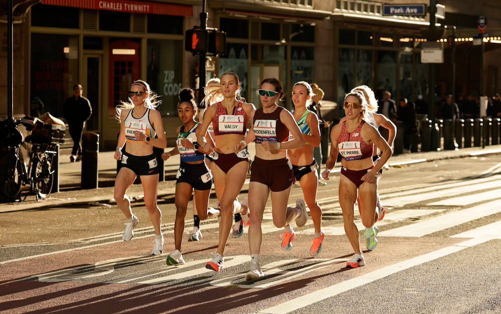 With 800m remaining in the race, Rodenfels had dropped a few strides behind the lead trio of Weini Kelati, Elle St. Pierre, and Parker Valby. It was enough that the on-screen graphic listed her in the “chase” category rather than as one of the leaders. But anyone who has seen Rodenfels kick knows it’s not over until it’s over. And she knows how to run the NYC course.