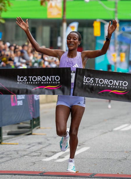Ethiopia’s Shure Demise won the Toronto Waterfront Marathon in 2:21:04, only five seconds off her personal best, which she set 10 years ago. Demise is returning to racing after a break to have her daughter two years ago. The race also served as the Canadian championship, which Rachel Hannah won in 2:33:47. (Results)