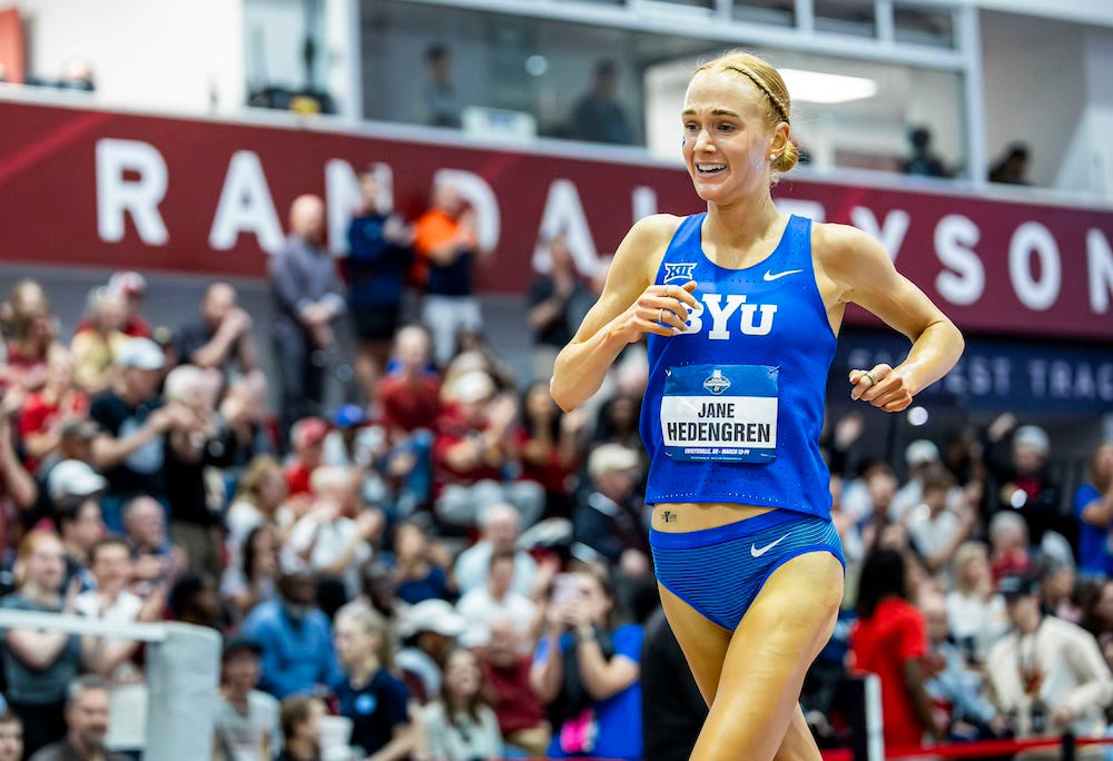 Top high school runners often win their races by leading wire to wire, but it’s rare that the same strategy translates well to NCAA racing. But BYU freshman Jane Hedengren is so good, and her pacing was so methodical, that she pulled it off over the weekend, winning the 5,000m/3,000m double at the NCAA Indoor Track & Field Championships in Fayetteville, Arkansas.