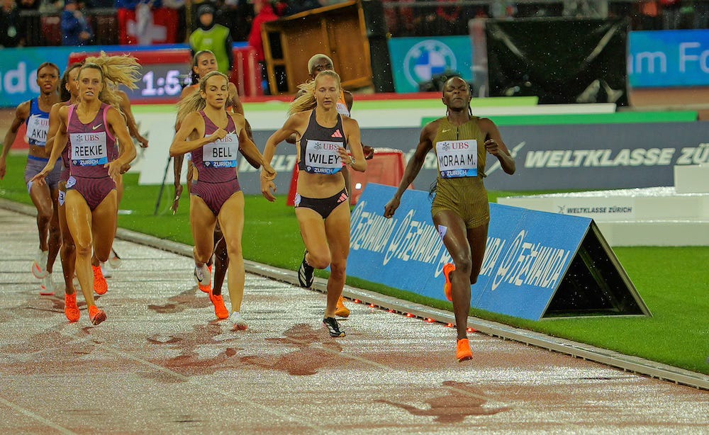 It also rained on Thursday’s Diamond League meet in Zurich, where Kenya’s Beatrice Chebet made a 5,000m world record attempt. But running a record in tough conditions, when her pacer lasted for less than half of the race, would have been tough. She put forth a valiant effort and won in 14:09.52. In addition to Karissa Schweizer’s fourth-place finish mentioned above, Elise Cranny (14:54.33) and Whittni Morgan (14:54.89) took eighth and ninth in what was a tactical race for much of the field. Mary Moraa earned another 800m victory, running 1:57.08. Great Britain’s Georgia Bell took second (1:57.94), and Addy Wiley earned her highest Diamond League finish yet, taking third in 1:58.16. In her first race since the Olympic Games, Sha’Carri Richardson won the 100m in 10.84 seconds, and Olympic champion Julien Alfred, of Saint Lucia, finished second in 10.88. (Results)