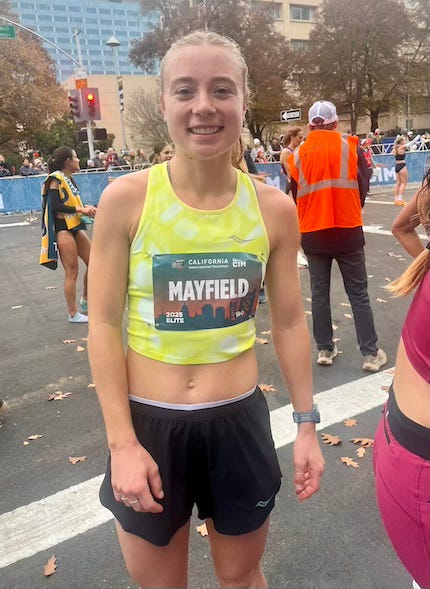 It was also in the midst of that sleep deprivation that Mayfield made her marathon debut at the 2025 Grandma’s Marathon. She decided to run the race off of her track training, she never found gels that worked for her, and though she put in a lot of hard work, it didn’t prepare her for the demands of the day. Her longest long run was about 16 miles, and it didn’t help that the race day weather was warm.
