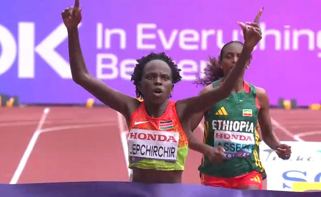 One of the bigger developments in the 1500m came in the days leading up to the meet when the AIU announced that they were appealing the Ethiopian Anti-Doping Authority’s decision to clear Diribe Welteji of a violation. The Court of Arbitration for Sport (CAS) ruled that she was ineligible to compete at worlds. It sounds like she refused to take an out-of-competition test on May 21. NBC has a brief summary here, but at this point, we have very few details. Welteji was fourth in the 1500m at the Paris Olympics, and earned silver at the 2023 world championships and 2025 world indoor championships. She hasn’t raced since the Prefontaine Classic, but she would have been one of the medal favorites in Tokyo.