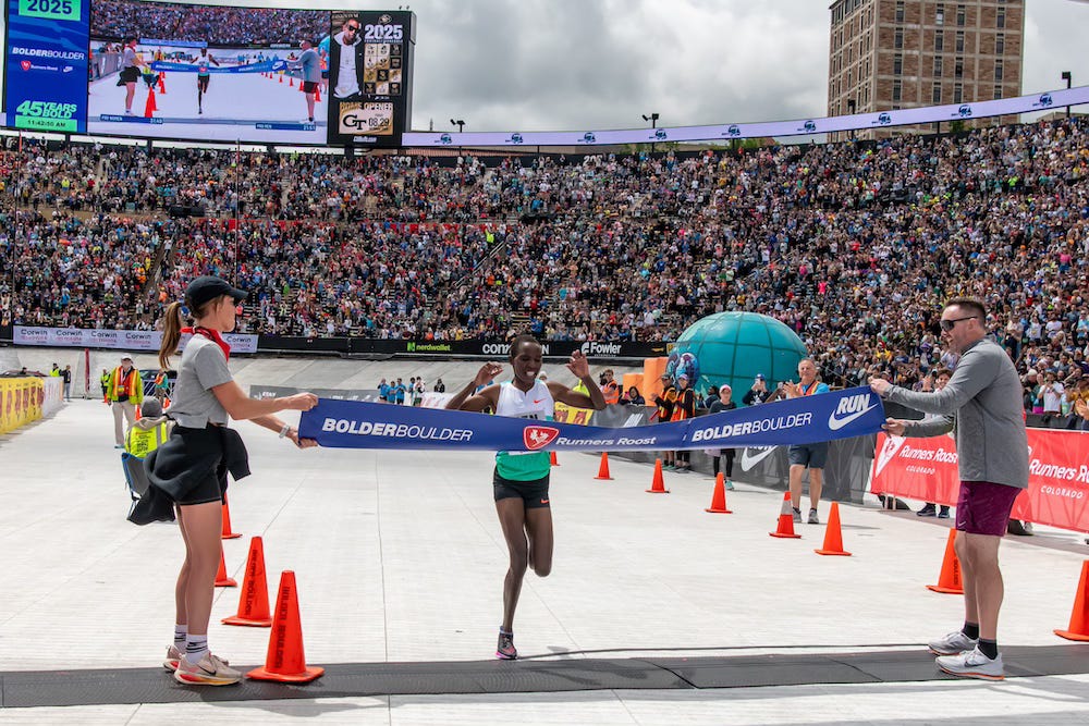 Kenya’s Grace Loibach Nawowuna pulled away in the third mile and repeated as Bolder Boulder 10K champion, running a course record of 31:52. Ethiopians Meseret Belete (32:39) and Alem Tsadik (32:43) were second and third, and Aubrey Frentheway (32:49) and Makena Morley (32:58) ran strong races to take fourth and fifth, respectively. Sara Vaughn won the citizen’s race in 34:42, her fastest time on the course thus far. Some people asked me why she wasn’t in the pro race. Vaughn told Fast Women she wasn’t sure how she’d feel only five weeks after running the Boston Marathon, and she made a last-minute decision to hop in. She also preferred the mass race because most years, the earlier start usually means racing in cooler conditions. (Results | Pro race replay | Daily Camera article about Vaughn’s run)